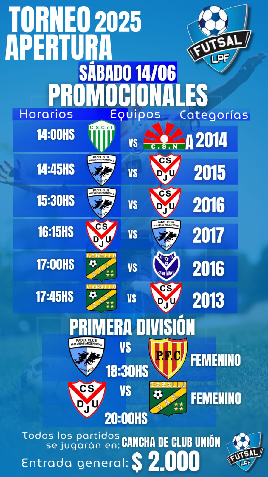 - 17:00 hs – Caballu vs C.S.D. 25 de Mayo (Categoría 2016)